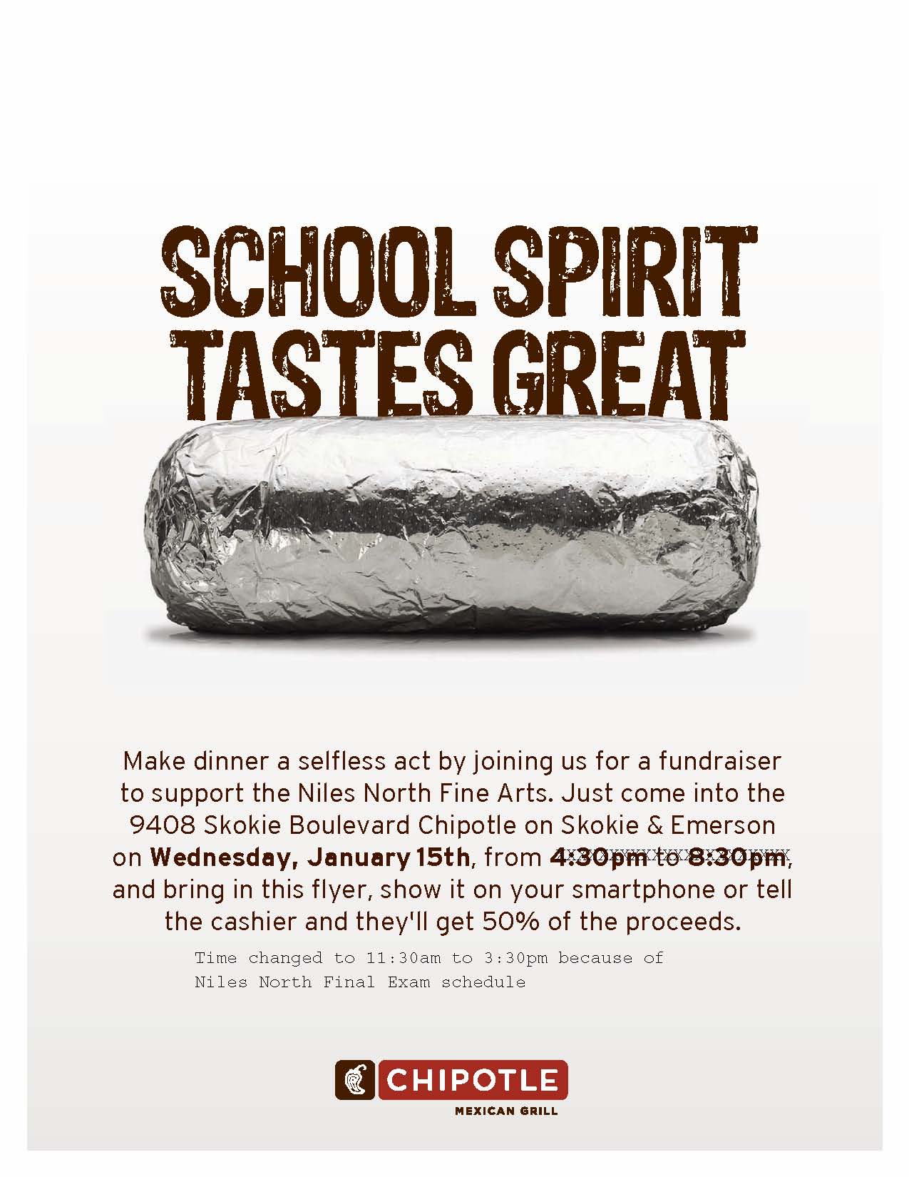Go to Chipotle at 9408 Skokie Boulevard between 11:30am and 3:30pm and they will generously donate 50% of their sales to NNFAPP! Bring in this flyer, or show it on your smartphone, or mention Niles North Fine Arts at the register. This time frame was chosen to be “student-friendly” because of NN Finals week.